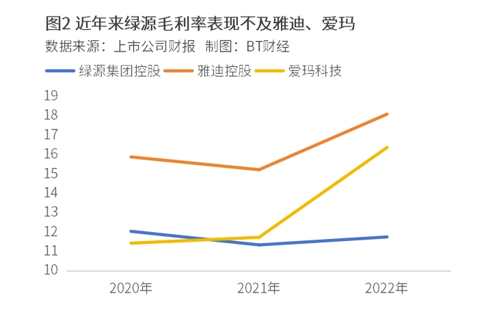 除了规模远不及头部企业外,绿源的盈利能力弱也是被市场诟病的问题。BT财经整理公开数据发现,2020年后,雅迪、爱玛两大头部品牌的毛利率均高于绿源,尤其是雅迪的利润率表现遥遥领先。