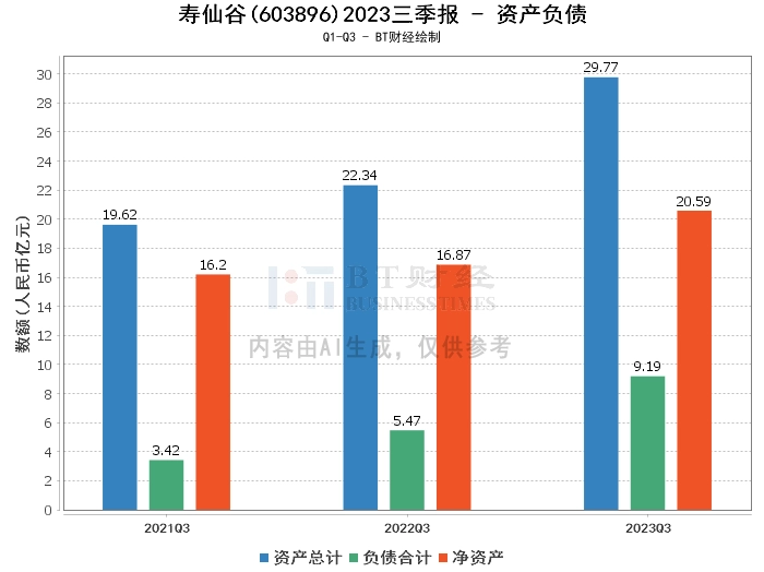 从2023年三季报的财务数据来看,寿仙谷的总资产由上年度末的28.56亿元增长到本报告期末的29.77亿元,增长幅度为4.23%。负债合计由上年度末的9.51亿元降低到本报告期末的9.19亿元,净资产由上年度末的19.06亿元增长到本报告期末的20.59亿元,增长幅度为8.03%。资产负债率由上年度末的33.28%降低到本报告期末的30.85%,显示出公司的负债水平在逐步降低,资产结构正在优化。
