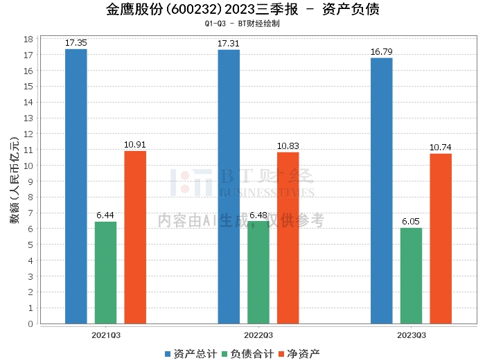 在资产负债方面,金鹰股份2023年三季度的总资产为16.79亿元,相较于上年度末的16.7亿元有所增长。负债合计为6.05亿元,相比上年度末的5.69亿元有所上升。净资产为10.74亿元,较上年度末的11.02亿元有所下降。资产负债率为36.05%,相比上年度末的34.06%有所上升。这些数据显示,公司的负债规模在扩大,净资产有所减少,资产负债率也有所上升,显示出公司的财务结构存在一定压力。