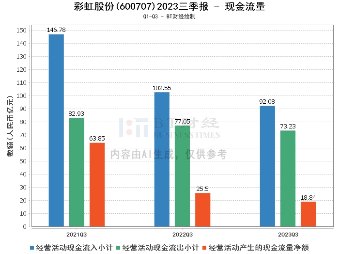 在现金流量方面,彩虹股份2023年三季度的经营活动产生的现金流量净额为18.84亿元,相较于上年同期的25.5亿元,下降了26.10%。经营活动现金流入小计为92.08亿元,相较于上年同期的102.55亿元,有所下降。经营活动现金流出小计为73.23亿元,相较于上年同期的77.05亿元,有所下降。这些数据显示,尽管公司的现金流量净额有所下降,但是现金流入和流出的规模都在一定程度上得到了控制。