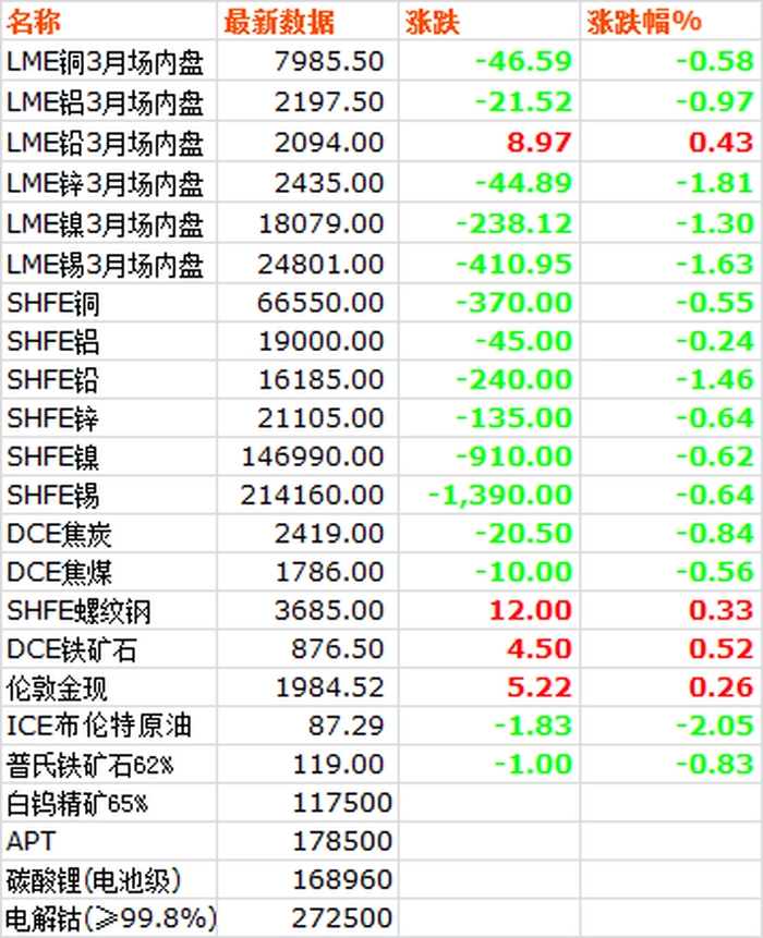 10月26日,LME六种基本金属价格跌多涨少,锌锡领跌。三月期铜价先扬后抑,收于7985.5美元/吨,下跌0.58%。三月期铝价冲高回落,收于2197.5美元/吨,下跌0.97%。三月期铅价震荡上行,收于2094美元/吨,上涨0.43%。三月期锌价震荡下行,收于2435美元/吨,下跌1.81%。三月期锡价收于24801美元/吨,下跌1.63%。三月期镍价收于18079美元/吨,下跌1.30%。