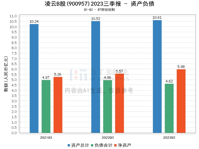 从资产负债方面来看,凌云B股2023年三季度的总资产为10.61亿元,相比上年度末的10.66亿元略有下降。负债合计为4.62亿元,较上年度末的5亿元有所减少。公司的净资产为5.98亿元,相比上年度末的5.67亿元有所增长。资产负债率为43.59%,较上年度末的46.84%有所下降。
