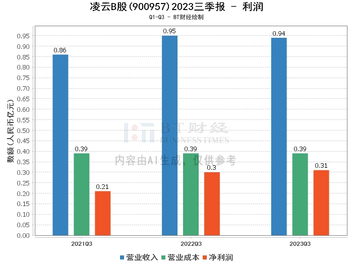 在利润方面,凌云B股2023年三季度的营业收入为9442.33万元,与上年同期的9451.15万元相差不大。营业利润为3431.25万元,较上年同期的3252.7万元有所增长。净利润为3144.06万元,较上年同期的3025.67万元有所增长。毛利率为58.92%,与上年同期的58.96%基本持平。净利率为33.3%,较上年同期的32.01%有所提高。