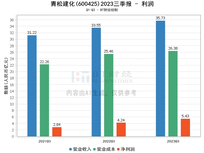 在利润方面,青松建化2023年三季度的营业收入为35.73亿元,较上年同期的33.55亿元有所增长。营业成本为26.38亿元,较上年同期的25.46亿元有所增长。尽管营业成本有所上升,但由于营业收入的增长更为显著,公司的毛利率和净利率均有所提高,分别为26.16%和15.21%。净利润为5.43亿元,较上年同期的4.24亿元有显著增长。这些数据显示,公司的盈利能力在提高。