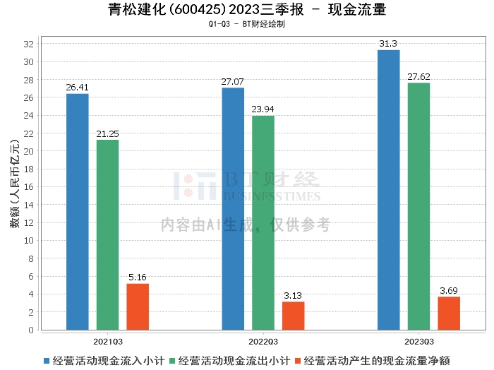 在现金流量方面,青松建化2023年三季度经营活动产生的现金流量净额为3.69亿元,较上年同期的3.13亿元有所增长。经营活动现金流入小计为31.3亿元,经营活动现金流出小计为27.62亿元。这些数据显示,公司的现金流量状况良好,经营活动产生的现金流量能够覆盖经营活动的现金流出。