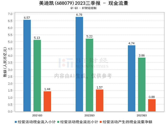 从现金流量方面来看,美迪凯2023年三季度经营活动产生的现金流量净额为8817.82万元,较上年同期的1.57亿元有所下滑。经营活动现金流入小计为4.74亿元,较上年同期的6.78亿元有所减少。经营活动现金流出小计为3.86亿元,较上年同期的5.22亿元有所减少。