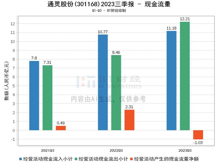 从现金流量方面来看,通灵股份2023年三季度的经营活动产生的现金流量净额为-1.03亿元,相比上年同期的2.31亿元有所下滑。经营活动现金流入小计为11.18亿元,相比上年同期的10.77亿元有所增加。经营活动现金流出小计为12.21亿元,相比上年同期的8.46亿元有所增加。