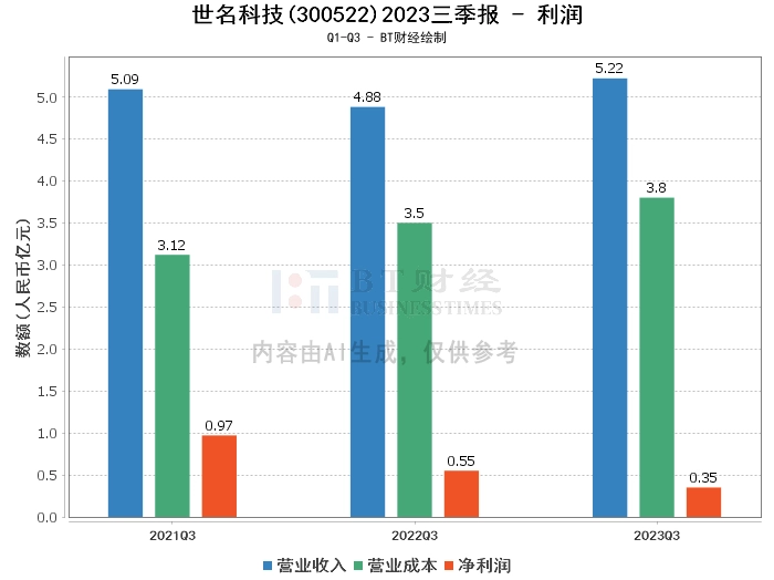 在利润方面,世名科技2023年三季度的营业收入为5.22亿元,相比上年同期的4.89亿元有所增长。营业利润为3630.47万元,相比上年同期的5980.14万元有所下降。营业成本为3.8亿元,相比上年同期的3.5亿元有所增加。净利润为3468.57万元,相比上年同期的5498.2万元有所下降。