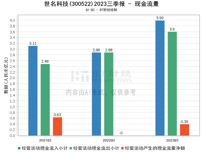 在现金流量方面,世名科技2023年三季度的经营活动产生的现金流量净额为3901.77万元,相比上年同期的-70.16万元大幅提升。经营活动现金流入小计为3.99亿元,相比上年同期的2.89亿元有所增长。经营活动现金流出小计为3.6亿元,相比上年同期的2.9亿元有所增加。