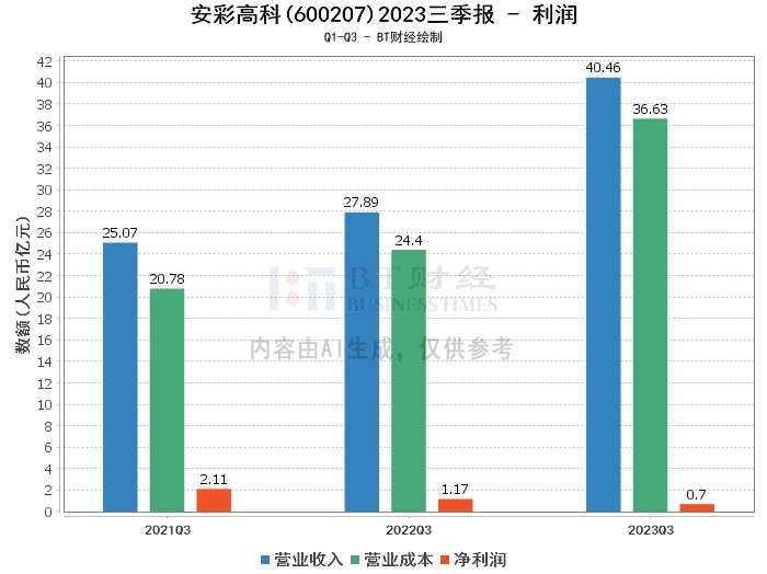 其次,从利润方面来看,安彩高科2023年三季度的营业收入为40.46亿元,较上年同期的27.89亿元有所增加。这主要得益于报告期光伏玻璃销量的增加。然而,公司的营业利润为1.07亿元,较上年同期的1.42亿元有所下降。营业成本为36.63亿元,较上年同期的24.4亿元有所增加。净利润为6991.2万元,较上年同期的1.17亿元大幅下降。这主要是由于报告期产品平均售价的降低,以及动力价格较去年同期的上涨。