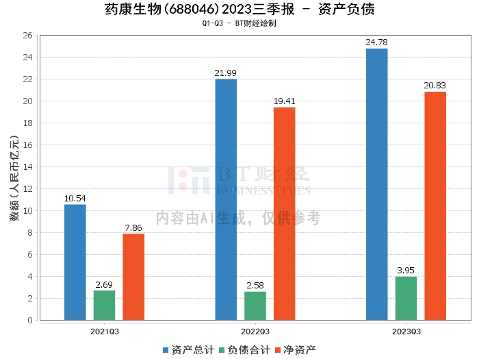 首先,从资产负债方面来看,药康生物2023年三季度的总资产为24.78亿元,相比上年度末的22.54亿元,增长了9.96%。负债合计为3.95亿元,相比上年度末的2.76亿元,增长了43.12%。净资产为20.83亿元,相比上年度末的19.78亿元,增长了5.32%。资产负债率为15.95%,相比上年度末的12.25%,有所上升。