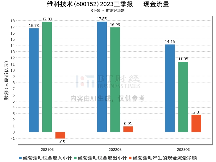 在现金流量方面,公司2023年三季度经营活动产生的现金流量净额为2.8亿元,较上年同期的9145.99万元有所增加。经营活动现金流入小计为14.16亿元,较上年同期的17.85亿元减少。经营活动现金流出小计为11.35亿元,较上年同期的16.93亿元减少。这表明公司在现金流管理上有所改善,但仍需进一步提高经营效率。