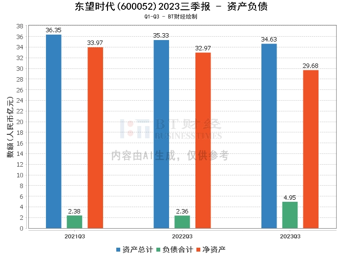 从资产负债方面来看,东望时代2023年三季度的总资产为34.63亿元,相比上年度末的35.38亿元有所减少。负债合计为4.95亿元,较上年度末的5.8亿元有所下降。公司的净资产为29.68亿元,略高于上年度末的29.58亿元。资产负债率为14.29%,较上年度末的16.38%有所降低。