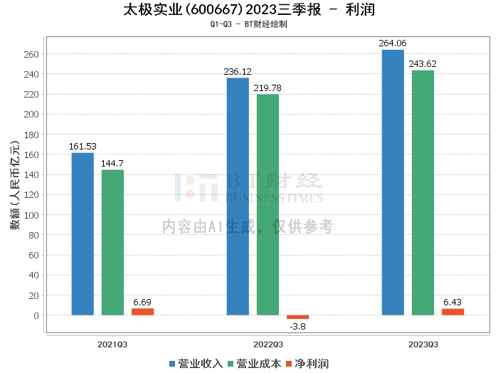 在利润方面,太极实业2023年三季度的营业收入为264.06亿元,相比上年同期的236.12亿元有所增长。营业利润为7.42亿元,相比上年同期的-2.61亿元,实现了扭亏为盈。营业成本为243.62亿元,相比上年同期的219.78亿元有所增长。净利润为6.43亿元,相比上年同期的-3.8亿元,实现了扭亏为盈。