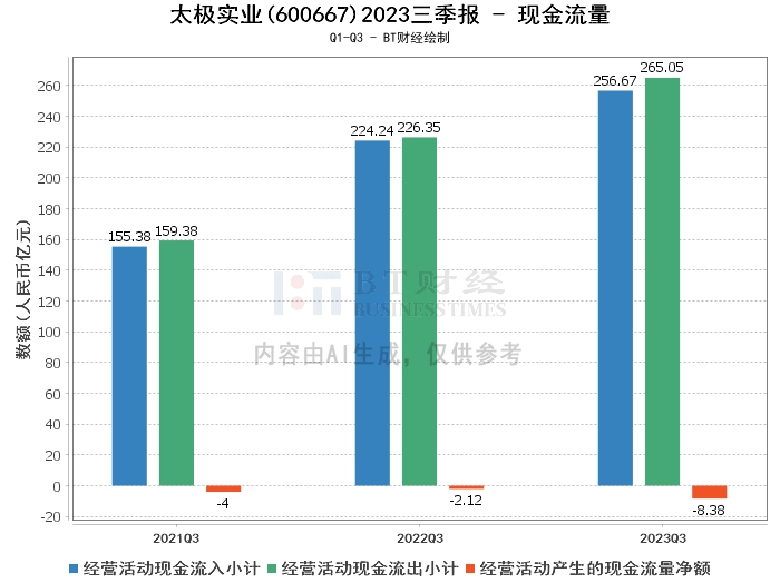 在现金流量方面,太极实业2023年三季度的经营活动现金流入小计为256.67亿元,相比上年同期的224.24亿元有所增长。经营活动现金流出小计为265.05亿元,相比上年同期的226.35亿元有所增长。