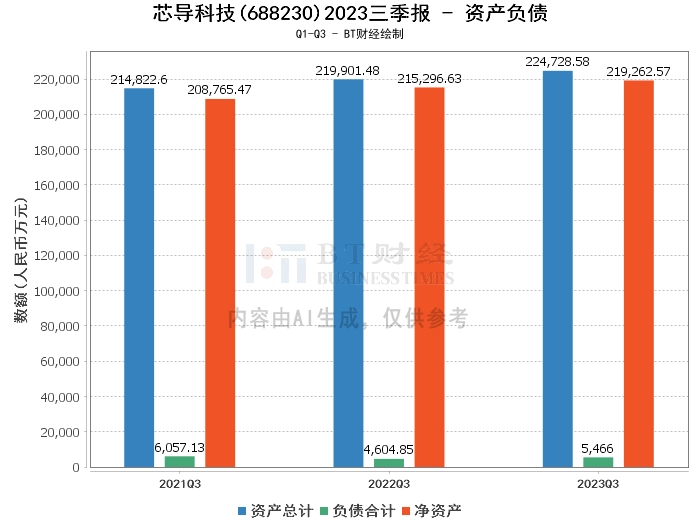 从资产负债方面来看,芯导科技2023年三季度末的总资产为22.47亿元,相较于上年度末的22.13亿元,增长了1.56%。负债合计为5466万元,相较于上年度末的4166.24万元,增长了31.23%。净资产为21.93亿元,相较于上年度末的21.71亿元,增长了1.02%。资产负债率为2.43%,相较于上年度末的1.88%,有所上升。