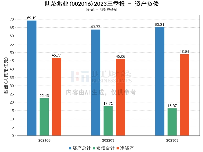 从资产负债方面看,2023年三季度末,世荣兆业的总资产为65.31亿元,较上年度末的65.81亿元略有下降。负债总额为16.37亿元,较上年度末的19.52亿元减少了16.16%,资产负债率为25.07%,较上年度末的29.66%下降了4.59个百分点。这表明公司的负债结构得到了优化,偿债能力有所提升。净资产为48.94亿元,较上年度末的46.29亿元增长了5.72%,说明公司的净资产规模在稳步扩大。