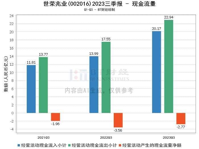 从现金流量方面看,2023年前三季度,世荣兆业的经营活动产生的现金流入为20.17亿元,较上年同期的13.99亿元增长了44.17%,但经营活动产生的现金流出为22.94亿元,较上年同期的17.55亿元增长了30.74%。这表明公司在扩大经营规模的同时,也需要面对更大的经营压力。
