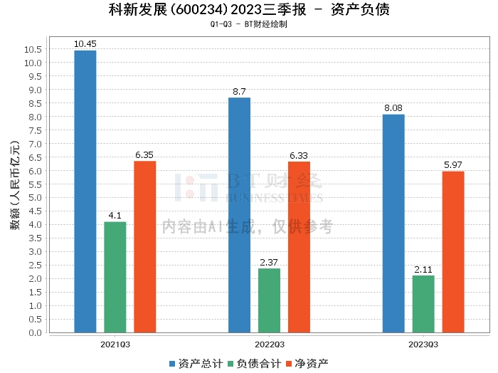 从资产负债方面来看,科新发展公司2023年三季度末的总资产为8.08亿元,相比上年度末的8.47亿元,总资产有所减少。负债合计为2.11亿元,相比上年度末的2.3亿元,负债总额有所减少。净资产为5.97亿元,相比上年度末的6.17亿元,净资产有所减少。资产负债率为26.15%,相比上年度末的27.17%,资产负债率有所下降。