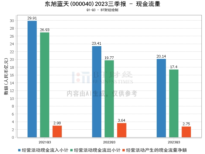 在现金流量方面,公司2023年三季度经营活动产生的现金流量净额为2.75亿元,相比上年同期的3.64亿元有所下降。经营活动现金流入小计为20.14亿元,相比上年同期的23.41亿元有所下降。经营活动现金流出小计为17.4亿元,相比上年同期的19.77亿元有所下降。
