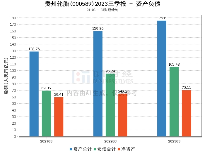 从财务角度看,贵州轮胎2023年三季度的总资产达到了175.6亿元,相比上年度末的157.62亿元有所增长。负债合计105.48亿元,相比上年度末的92.8亿元也有所上升。公司的净资产为70.11亿元,较上年度末的64.82亿元有所提升。资产负债率为60.07%,略高于上年度末的58.88%。