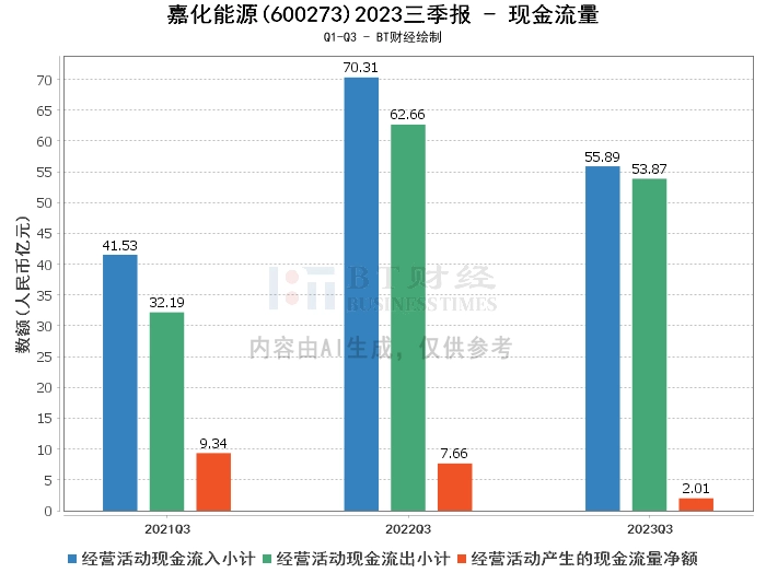 在现金流量方面,嘉化能源2023年三季度的经营活动产生的现金流量净额为2.01亿元,较上年同期的7.66亿元大幅减少。经营活动现金流入小计为55.89亿元,较上年同期的70.31亿元减少。经营活动现金流出小计为53.87亿元,较上年同期的62.66亿元减少。