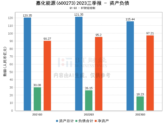 从资产负债方面来看,嘉化能源2023年三季度的总资产为115.44亿元,相比上年度末的122.71亿元有所下降。负债合计为18.23亿元,较上年度末的24.78亿元减少。净资产为97.21亿元,与上年度末的97.93亿元相比略有下降。资产负债率为15.79%,较上年度末的20.19%有所降低。