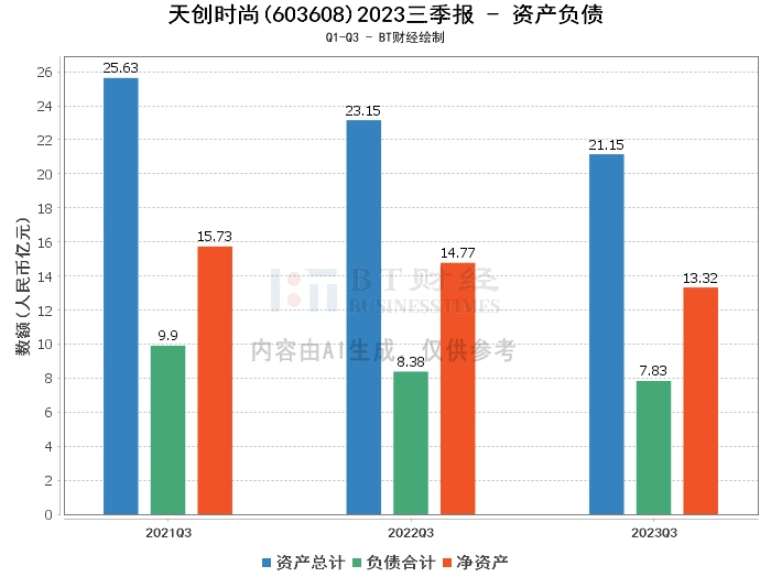 在资产负债方面,天创时尚2023年三季度的总资产为21.15亿元,较上年度末的21.44亿元略有下降。负债合计为7.83亿元,较上年度末的7.94亿元也有所下降。净资产为13.32亿元,较上年度末的13.5亿元略有减少。资产负债率为37.03%,与上年度末的37.04%基本持平。这些数据显示,公司的资产负债状况总体稳定。