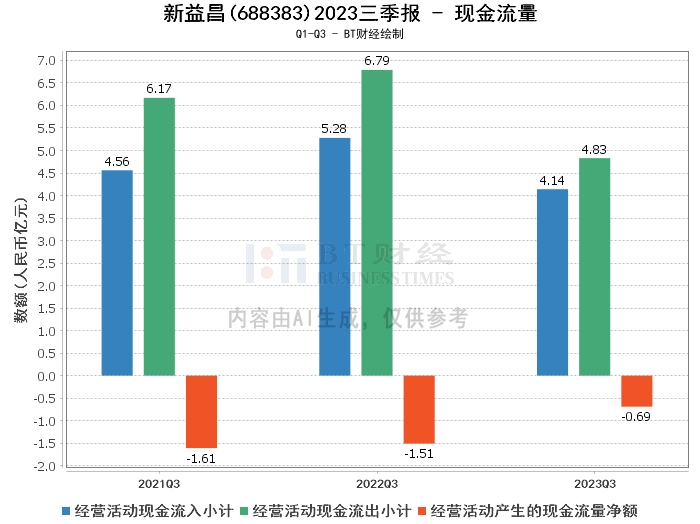 在现金流量方面,新益昌2023年三季度经营活动产生的现金流入为4.14亿元,较上年同期的5.28亿元有所减少。经营活动产生的现金流出为4.83亿元,较上年同期的6.79亿元有所减少。