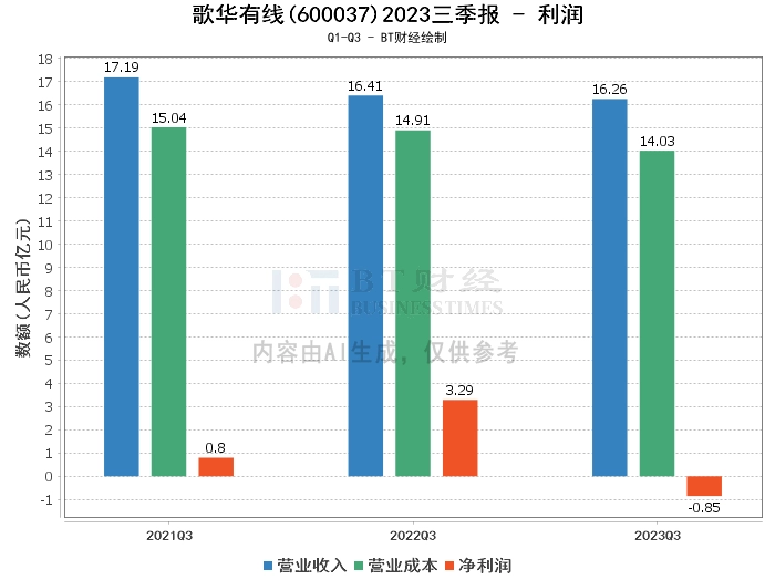 在利润方面,歌华有线2023年三季度的营业收入为16.26亿元,与上年同期的16.41亿元相比略有下降。营业利润为-3620.85万元,与上年同期的3.33亿元相比,公司的盈利能力有所下滑。净利润为-8453.96万元,与上年同期的3.27亿元相比,公司的净利润出现了较大幅度的下滑。这些数据显示,尽管公司的营业收入保持稳定,但净利润的大幅下滑表明公司的盈利能力出现了下滑。