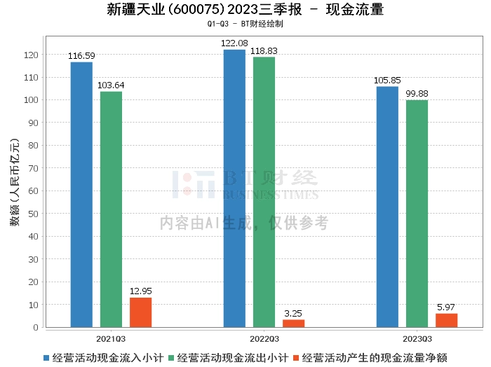 在现金流量方面,新疆天业2023年三季度经营活动产生的现金流量净额为5.97亿元,较上年同期的8.32亿元有所减少。经营活动现金流入小计105.85亿元,较上年同期的151.79亿元有所减少。经营活动现金流出小计99.88亿元,较上年同期的143.47亿元有所减少。
