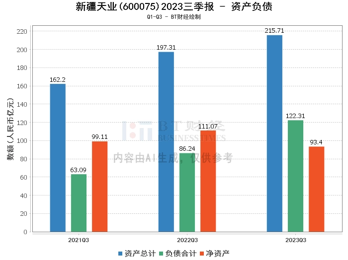 在资产负债方面,新疆天业2023年三季度末的总资产为215.71亿元,相比上年度末的261.39亿元有所减少。负债合计122.31亿元,相比上年度末的132.49亿元有所降低。净资产为93.4亿元,较上年度末的128.9亿元有所下降。资产负债率为56.7%,较上年度末的50.69%有所上升。