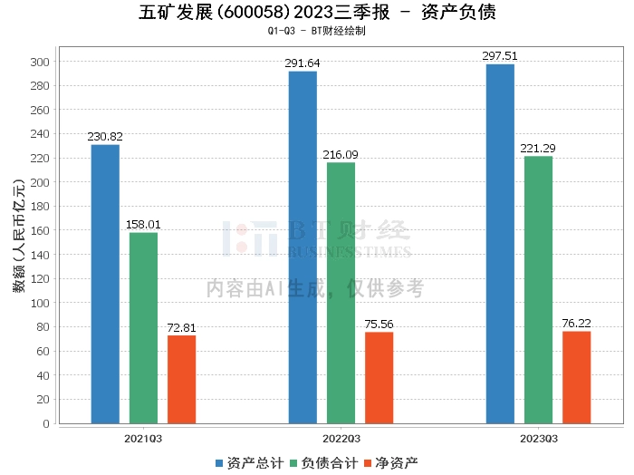 在资产负债方面,五矿发展的总资产由上年度末的228.46亿元增长到本报告期末的297.51亿元,负债合计由上年度末的178.74亿元增长到本报告期末的221.29亿元,净资产由上年度末的49.72亿元增长到本报告期末的76.22亿元。资产负债率由上年度末的78.24%降低到本报告期末的74.38%。
