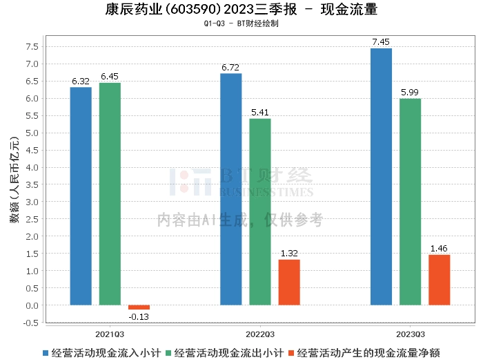 再次,从现金流量方面看,康辰药业的经营活动产生的现金流量净额在年初至本报告期末为1.46亿元,较上年同期的1.32亿元有所增长。经营活动现金流入小计在年初至本报告期末为7.45亿元,较上年同期的6.72亿元有所增长。经营活动现金流出小计在年初至本报告期末为5.99亿元,较上年同期的5.41亿元有所增长。