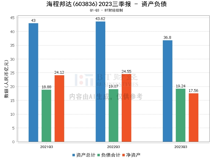 在资产负债方面,海程邦达2023年三季度的总资产为36.8亿元,相比上年度末的39.78亿元有所下降。负债合计为19.24亿元,较上年度末的21.78亿元减少。净资产为17.56亿元,略低于上年度末的18亿元。资产负债率为52.28%,较上年度末的54.74%有所下降。