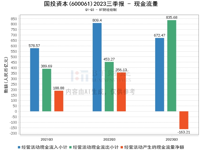 再次,从现金流量方面来看,2023年三季度,国投资本的经营活动产生的现金流量净额为-163.21亿元,相比上年同期的356.13亿元转为负值。经营活动现金流入小计为672.47亿元,相比上年同期的809.4亿元有所下降。经营活动现金流出小计为835.68亿元,相比上年同期的453.27亿元有所增长。