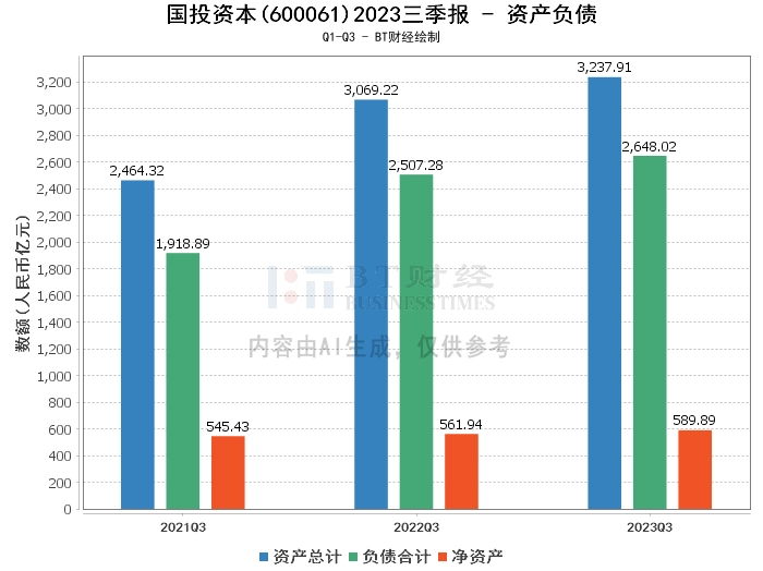 首先,从资产负债方面来看,2023年三季度末,国投资本的总资产达到3237.91亿元,相比上年度末的2665.93亿元增长了21.45%。负债合计为2648.02亿元,相比上年度末的2099.81亿元增长了26.13%。净资产为589.89亿元,相比上年度末的566.12亿元增长了4.19%。资产负债率为81.78%,相比上年度末的78.76%有所上升。