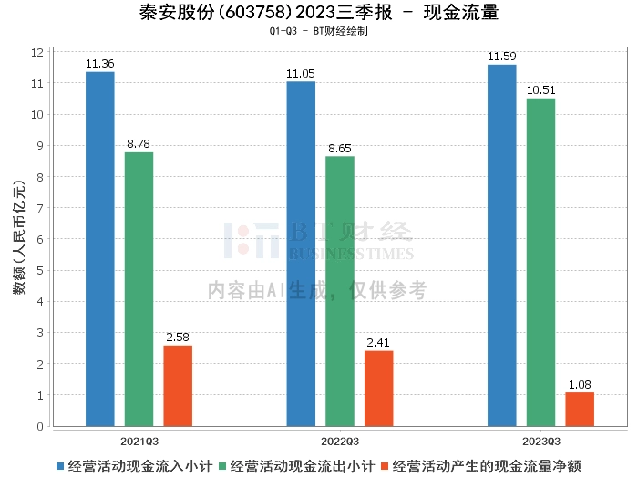 在现金流量方面,秦安股份2023年三季度经营活动产生的现金流量净额为1.08亿元,相比上年同期的2.41亿元有所下降。经营活动现金流入小计为11.59亿元,相比上年同期的11.05亿元有所增加。经营活动现金流出小计为10.51亿元,相比上年同期的8.65亿元有所增加。