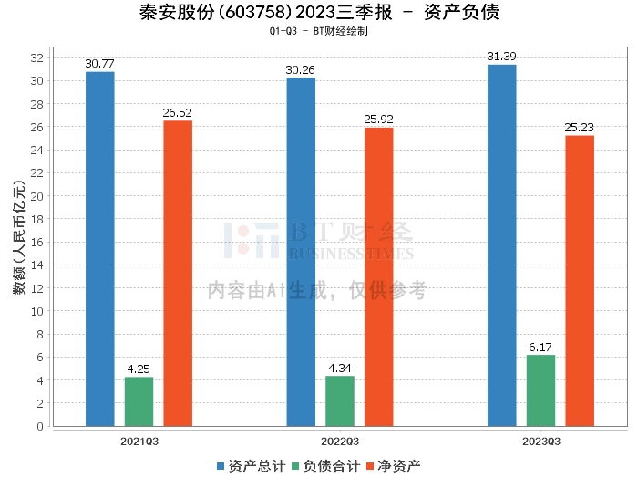 在资产负债方面,截至2023年三季度末,秦安股份的总资产为31.39亿元,相比上年度末的31.94亿元略有下降。负债合计为6.17亿元,相比上年度末的5.32亿元有所增加。净资产为25.23亿元,相比上年度末的26.62亿元有所下降。资产负债率为19.64%,相比上年度末的16.65%有所上升。