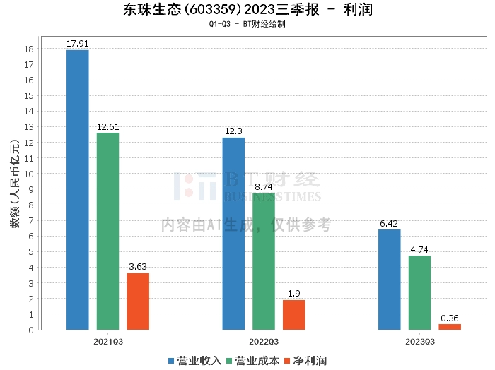 综上所述,东珠生态2023年三季度的业绩表现较为疲软,营业收入、营业利润、净利润等主要财务指标均出现较大幅度的下滑。这主要是由于公司受到宏观环境影响,新增订单减少,在建项目数量及规模有所下降;由于多种原因,项目建设进度缓慢。同时,公司银行借款增加,导致财务费用增加,以及公司计提的信用减值损失与资产减值损失增加。
