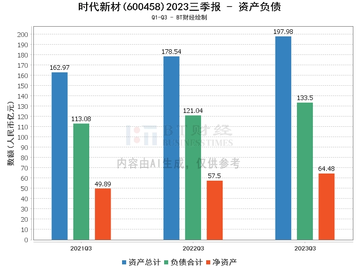 从资产负债方面来看,时代新材2023年三季度的总资产为197.98亿元,相较于上年度末的172.57亿元,总资产有所增长。负债合计为133.5亿元,相较于上年度末的109.28亿元,负债也有所增加。公司的净资产为64.48亿元,相较于上年度末的63.29亿元,净资产略有增长。资产负债率为67.43%,相较于上年度末的63.33%,资产负债率有所上升。