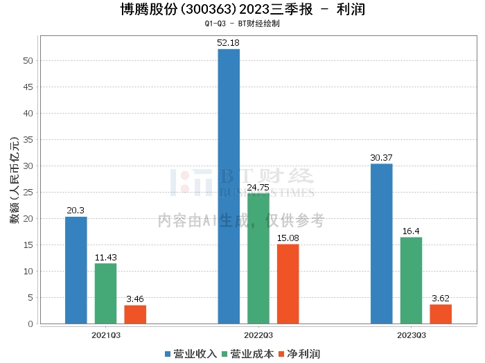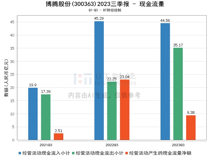 综上所述,博腾股份在2023年三季度的经营状况出现了一些下滑。在资产负债方面,公司的总资产和净资产均有所减少,但资产负债率也有所下降,显示公司的负债管理有所改善。在利润方面,公司的营业收入、营业利润和净利润均有所下滑,显示公司的盈利能力有所减弱。在现金流量方面,公司的经营活动产生的现金流量净额减少,但经营活动的现金流入和流出均有所增加,显示公司的经营活动仍然活跃。