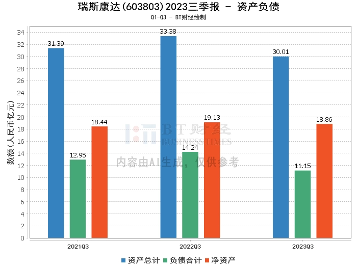 在资产负债方面,2023年三季度末,瑞斯康达的总资产为30.01亿元,相比上年度末的34.73亿元减少了13.58%。负债合计为11.15亿元,相比上年度末的15.22亿元减少了26.78%。净资产为18.86亿元,相比上年度末的19.52亿元减少了3.36%。资产负债率为37.16%,相比上年度末的43.81%减少了6.65个百分点。