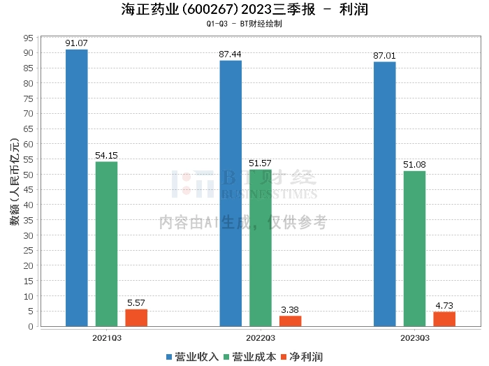 在利润方面,海正药业2023年三季度的营业收入为87.01亿元,与上年同期的87.44亿元相比略有下降。营业利润为6.29亿元,较上年同期的4.91亿元有所增长。营业成本为51.08亿元,较上年同期的51.57亿元略有下降。净利润为4.73亿元,较上年同期的3.38亿元增长显著。这些数据显示出海正药业在盈利能力上的提升。