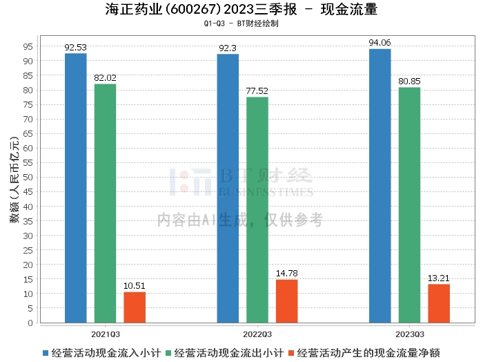 在现金流量方面,海正药业2023年三季度的经营活动产生的现金流量净额为13.21亿元,较上年同期的14.78亿元有所下降。经营活动现金流入小计为94.06亿元,较上年同期的92.3亿元有所增长。经营活动现金流出小计为80.85亿元,较上年同期的77.52亿元有所增长。