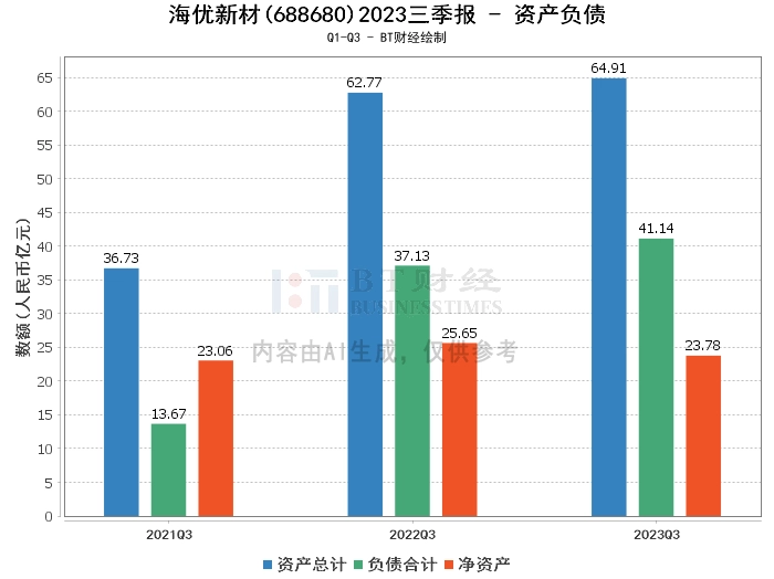 首先,从资产负债方面看,海优新材2023年三季度的总资产为64.91亿元,相比上年度末的64.78亿元略有增长。负债合计为41.14亿元,较上年度末的39.96亿元有所增加。净资产为23.78亿元,较上年度末的24.82亿元有所减少。资产负债率为63.37%,较上年度末的61.69%有所上升。