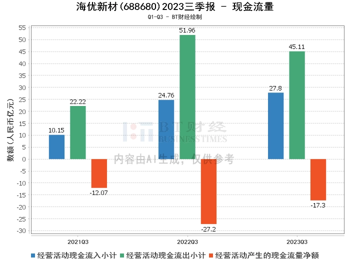 再次,从现金流量方面看,海优新材2023年三季度的经营活动现金流入小计为27.8亿元,较上年同期的24.76亿元有所增加。经营活动现金流出小计为45.11亿元,较上年同期的51.96亿元有所减少。