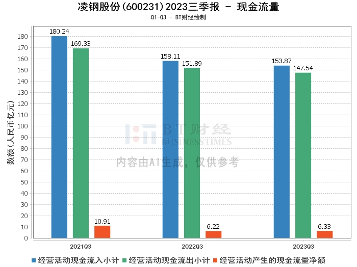 再次,从现金流量方面看,年初至2023年三季度末,凌钢股份经营活动产生的现金流量净额为6.33亿元,相较于上年同期的6.22亿元,有所增加。经营活动现金流入小计为153.87亿元,相较于上年同期的158.11亿元,有所减少。经营活动现金流出小计为147.54亿元,相较于上年同期的151.89亿元,有所减少。