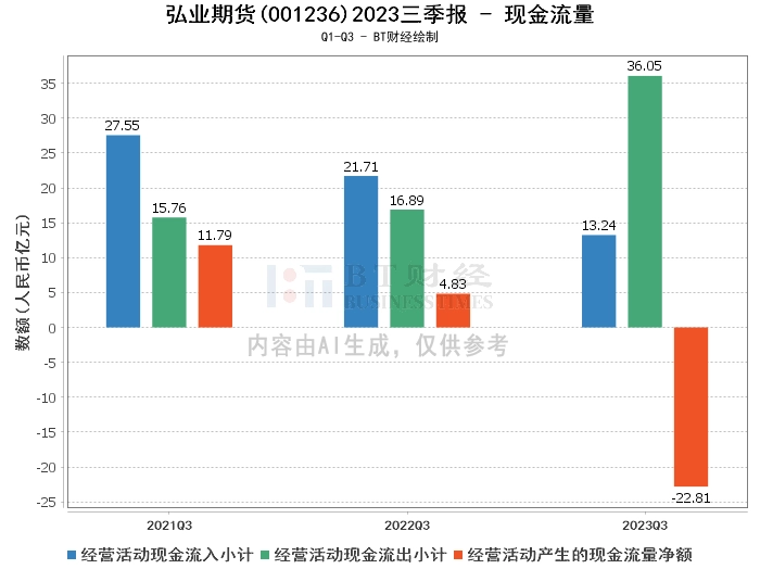 在现金流量方面,弘业期货公司2023年三季度的经营活动产生的现金流量净额为-22.81亿元,相比上年同期的4.83亿元,下降了572.65%。经营活动现金流入小计为13.24亿元,相比上年同期的21.71亿元,下降了38.97%。经营活动现金流出小计为36.05亿元,相比上年同期的16.89亿元,增长了113.52%。