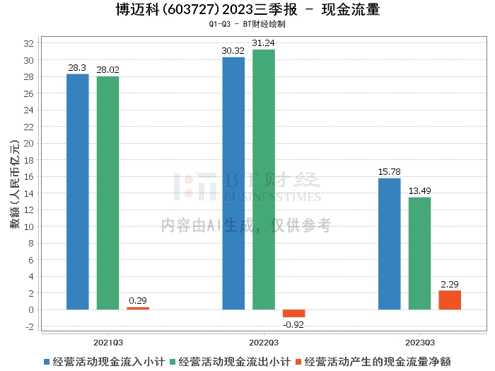 在现金流量方面,博迈科2023年三季度的经营活动产生的现金流量净额为2.29亿元,较上年同期的-9217.68万元大幅提升。经营活动现金流入小计为15.78亿元,较上年同期的30.32亿元有所下滑。经营活动现金流出小计为13.49亿元,较上年同期的31.24亿元有所减少。这表明公司的现金流量状况有所改善,但仍需关注其现金流入的减少。